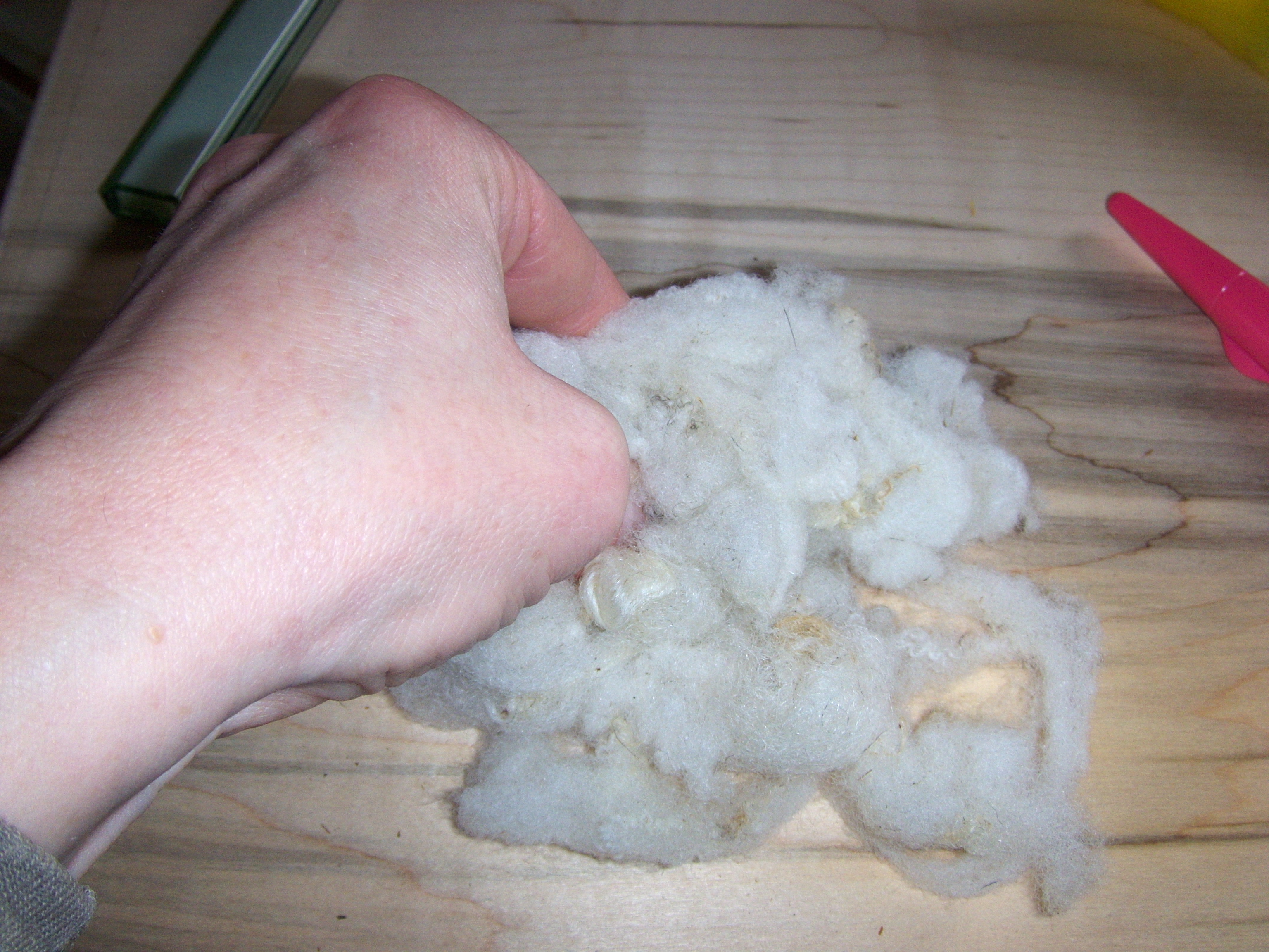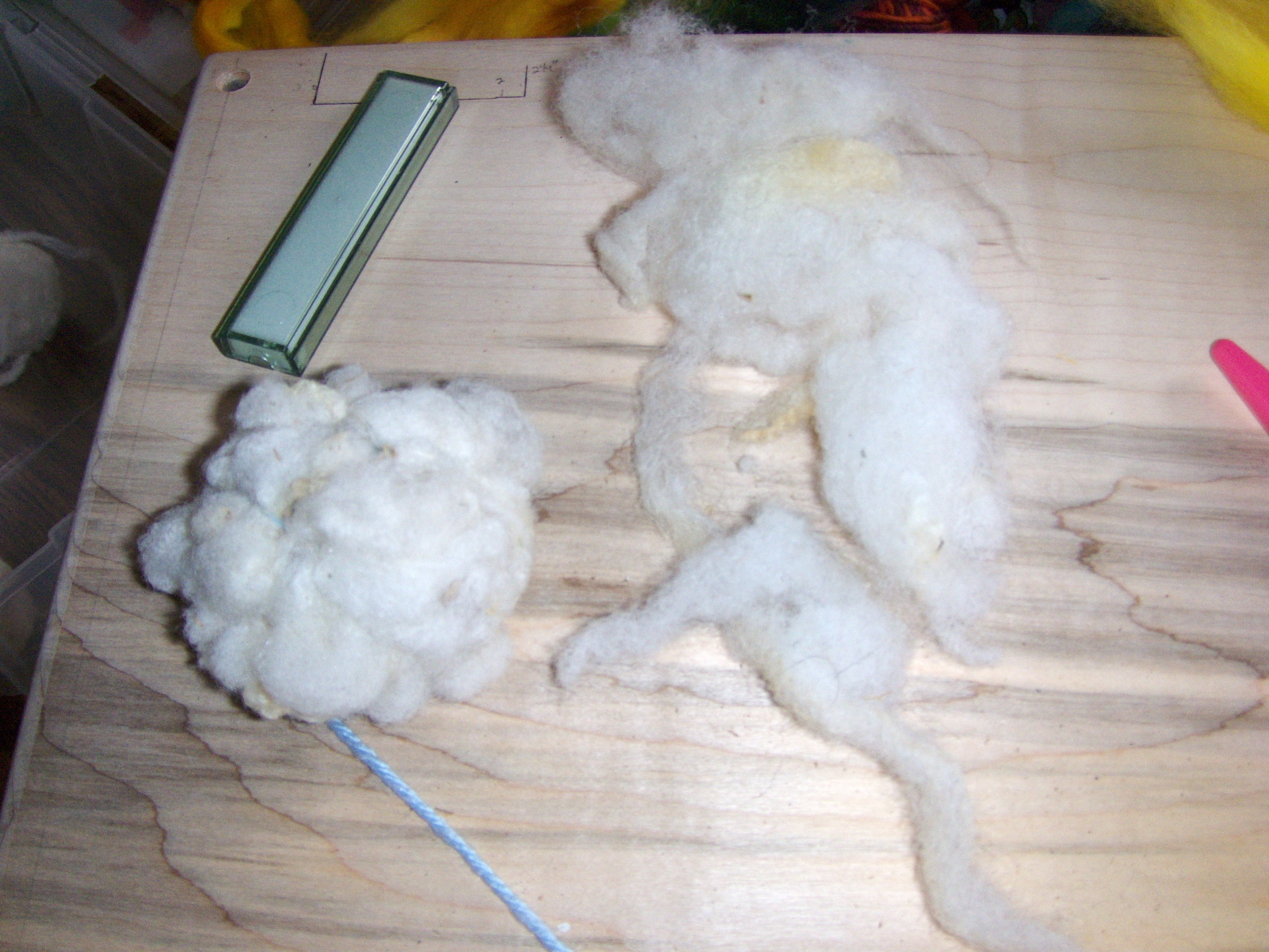 I start out with about a 1/2 ounce of washed wool. I prefer to work with loose, washed wool because it’s easier to compress by hand than a carded batt of wool.
