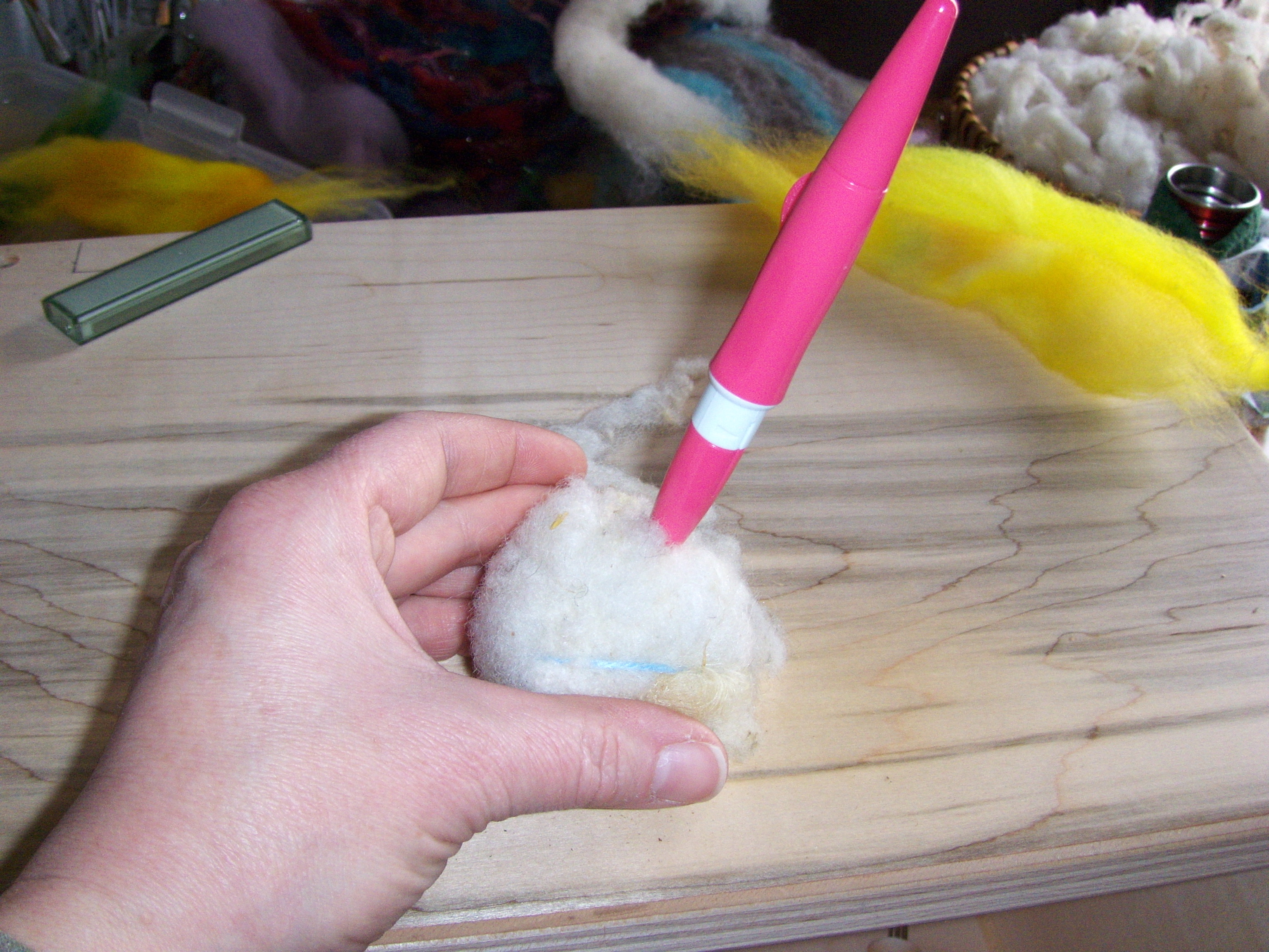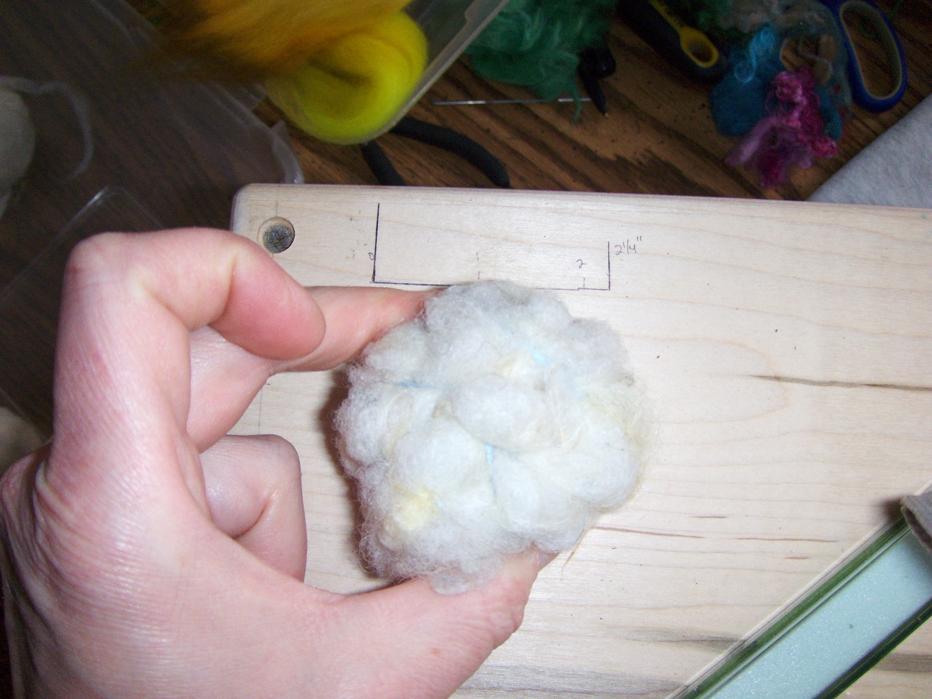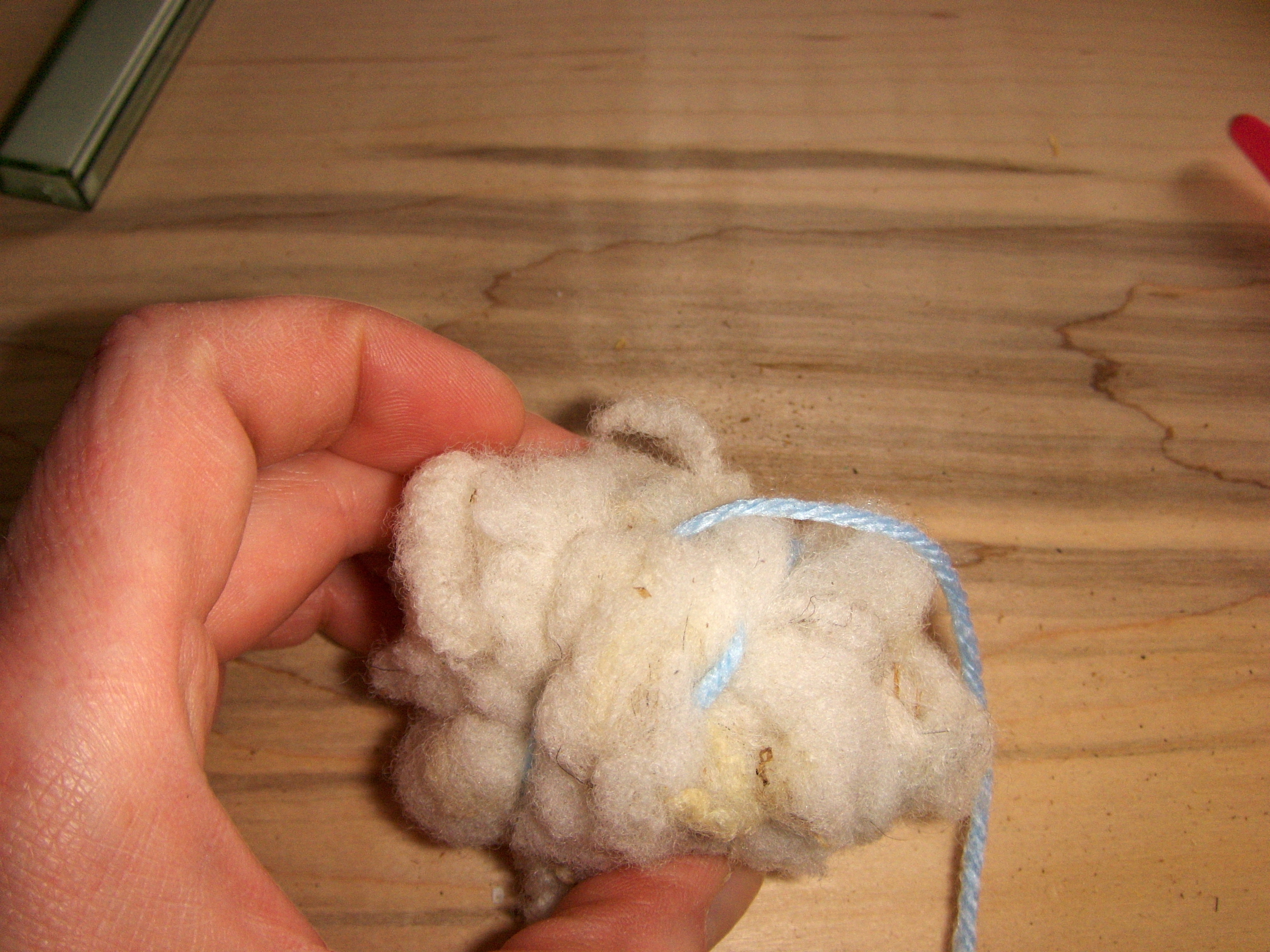 I compress or squeeze the wool tightly in my hand until it’s firm enough to start a binding yarn. The binding yarn will aid in holding the wool together as you wrap the yarn around it while squeezing the ball tighter.