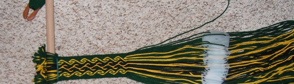 A couple of weeks ago, I started warped my loom for another running leaves card woven band/strap/belt. It turned out to be too wide to be a dog leash, so I’ve decided that it will make a great guitar strap or belt.