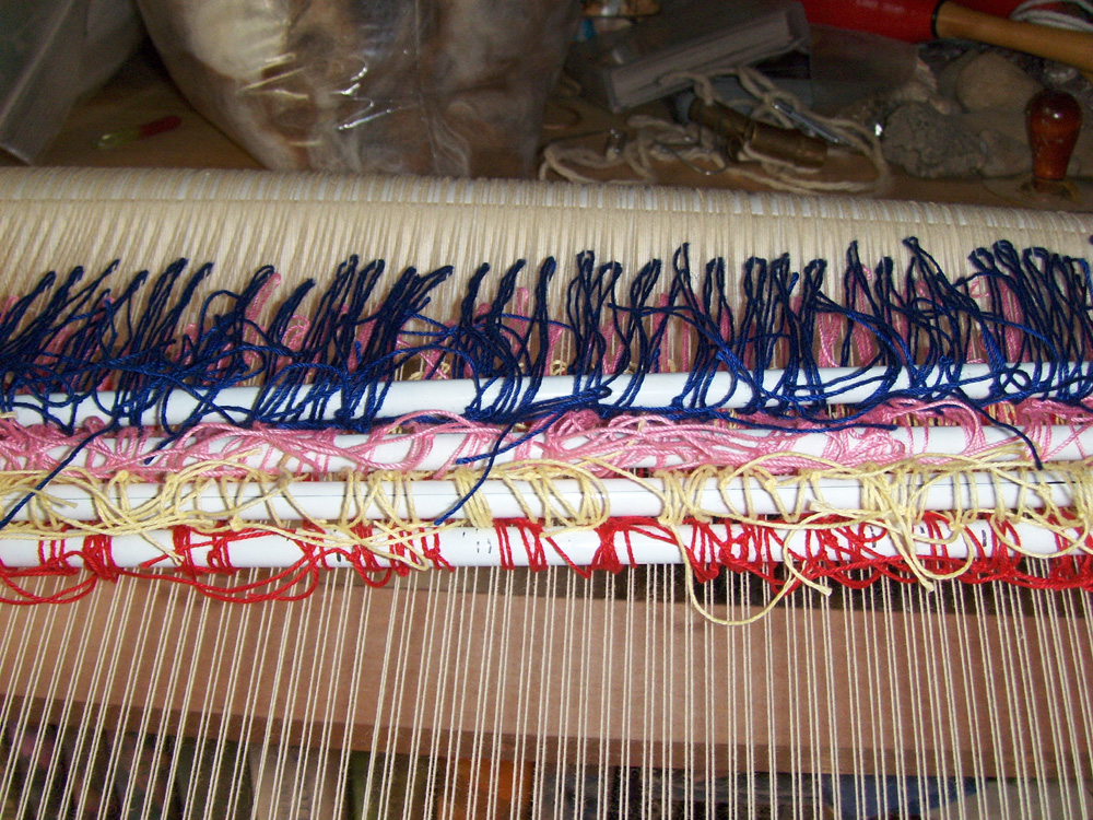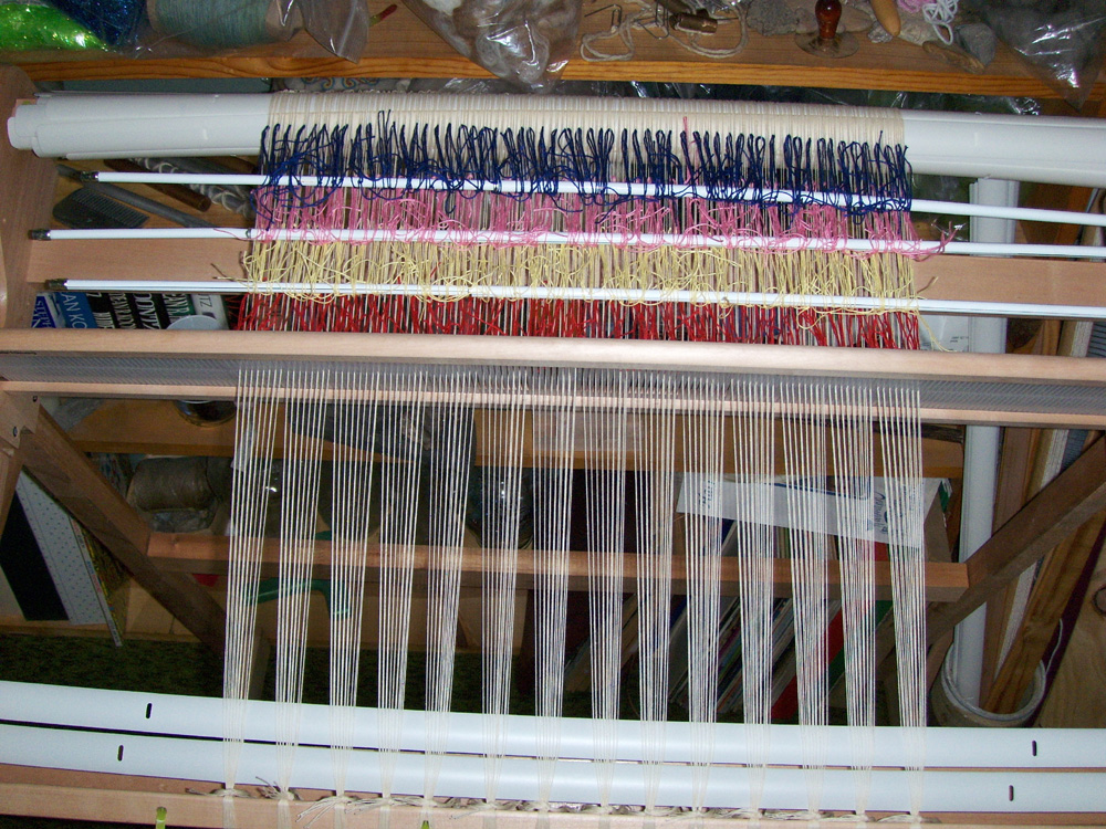 Now your warp is tied on. Slide a shed stick under every 1 of 4 warp threads. Basically you’re lifting the 1st thread onto the stick and skipping three, the lifting the next 1 onto the stick. When you’ve got them on the stick, tip it up sideways and follow the instructions (http://www.marlamallett.com/loom.htm at about the middle of the page) for looping the heddle around the warp thread and onto the harness. The picture below is the first harness (blue string heddles) finished and the number 2 warp threads raised up to have the pink heddles looped around them.