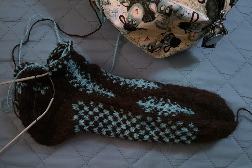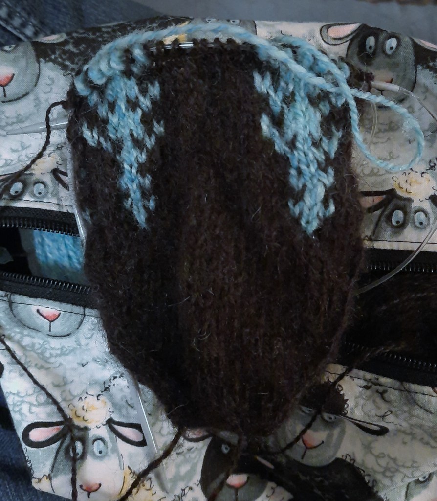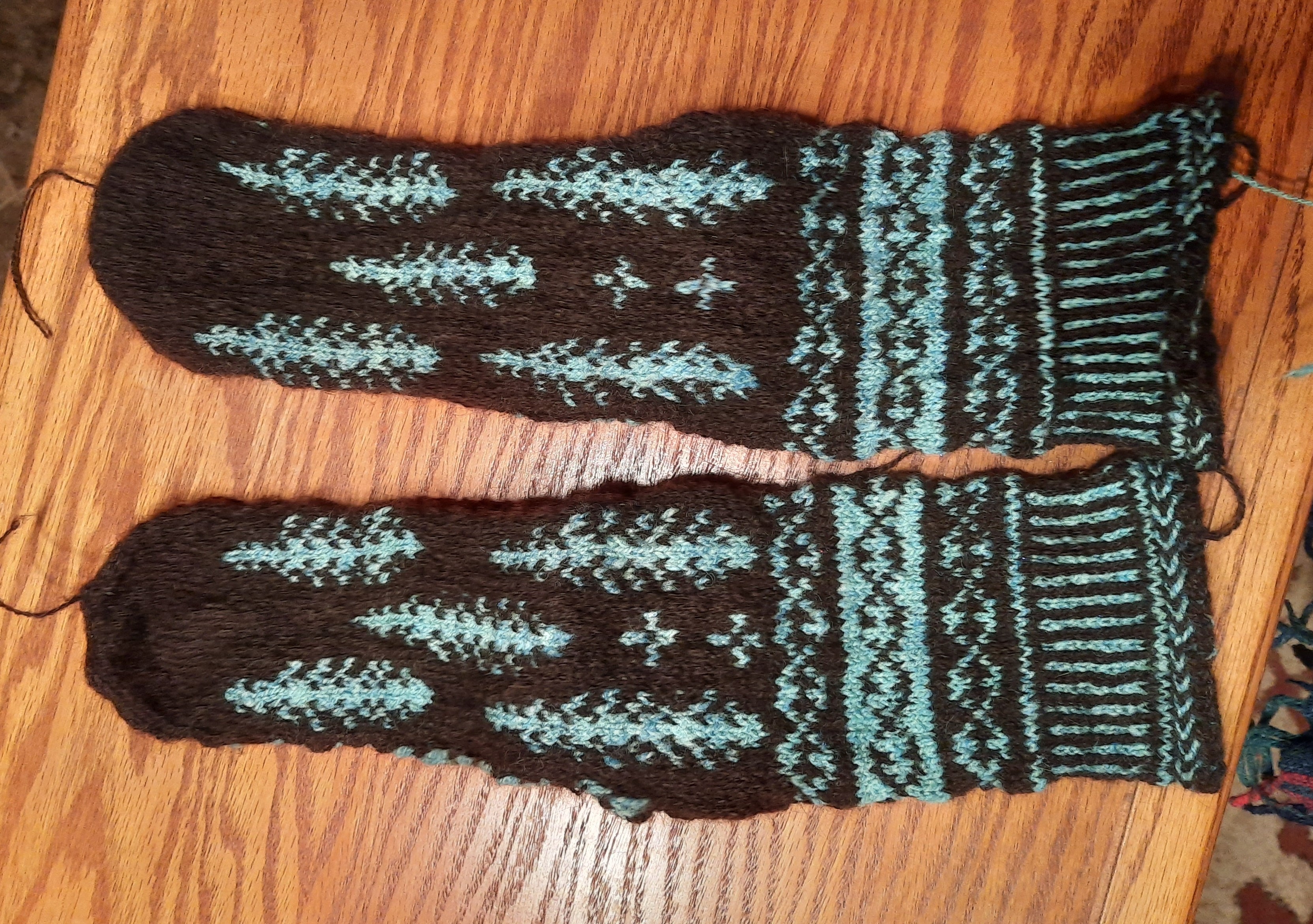So, the next pictures feature the custom designed, hand knit feather socks. They were knit with hand spun yarn I created using natural black Icelandic fleece from Copia Cove and Cornflower blue Suffolk fleece from the Ahrens’ family farm.