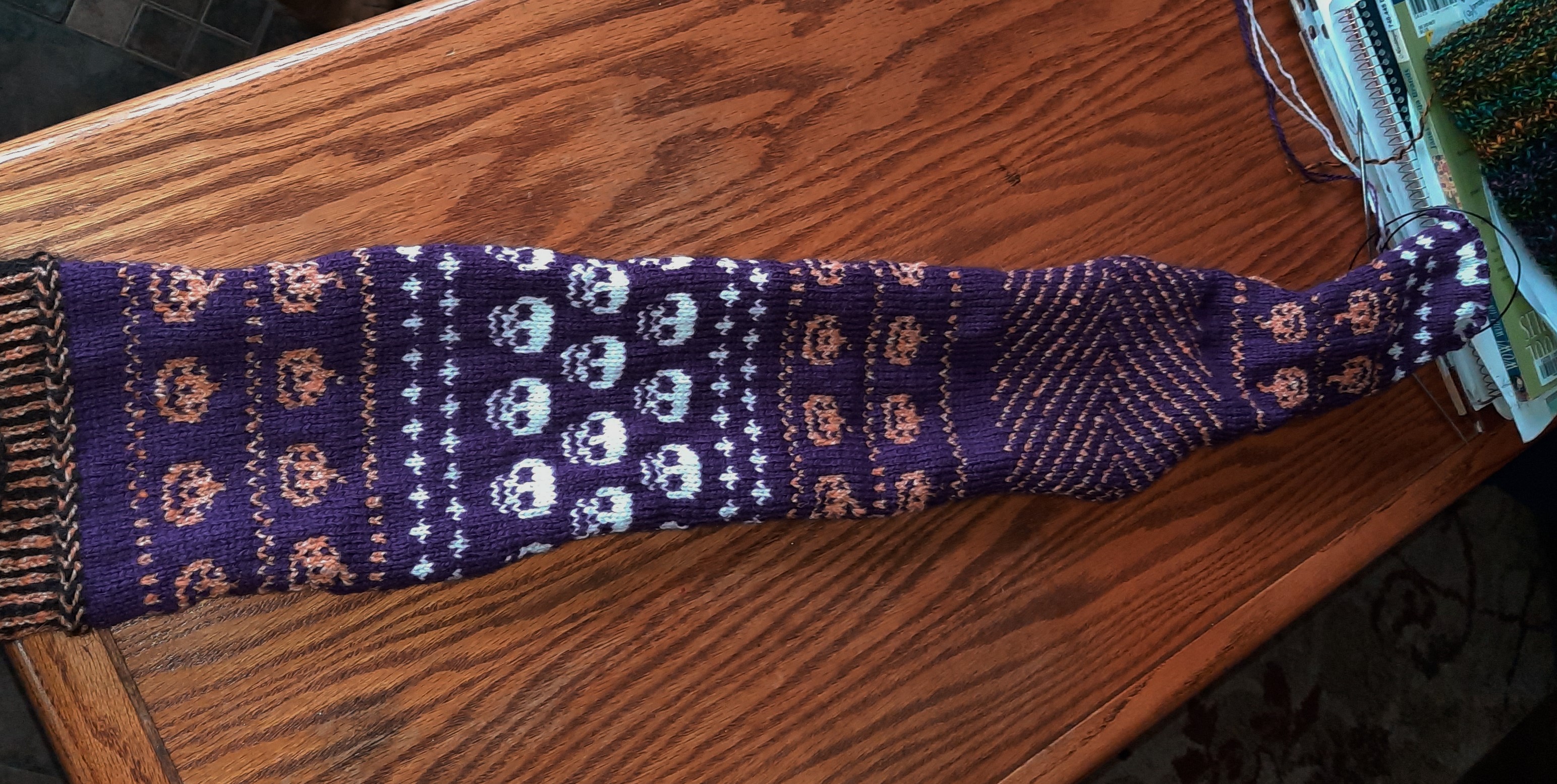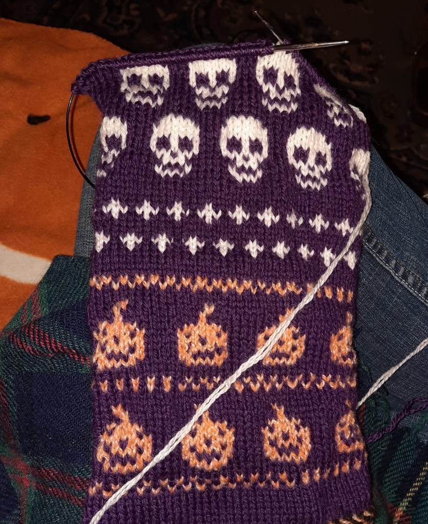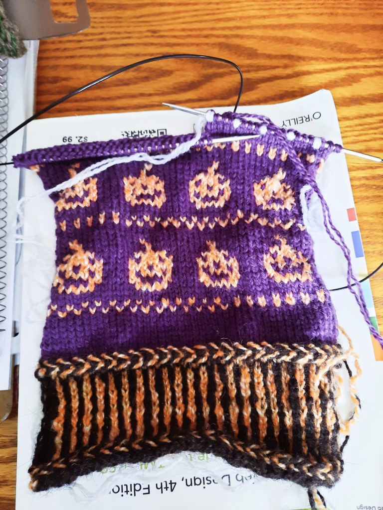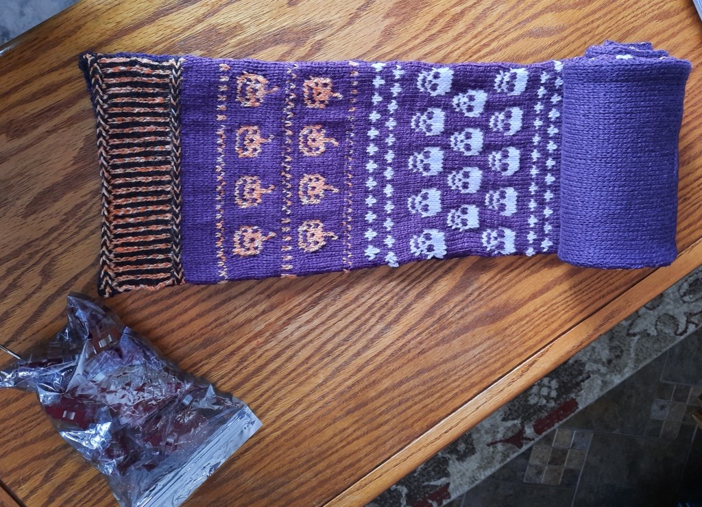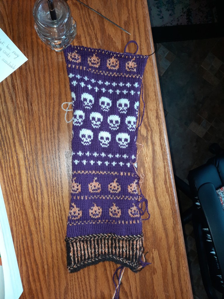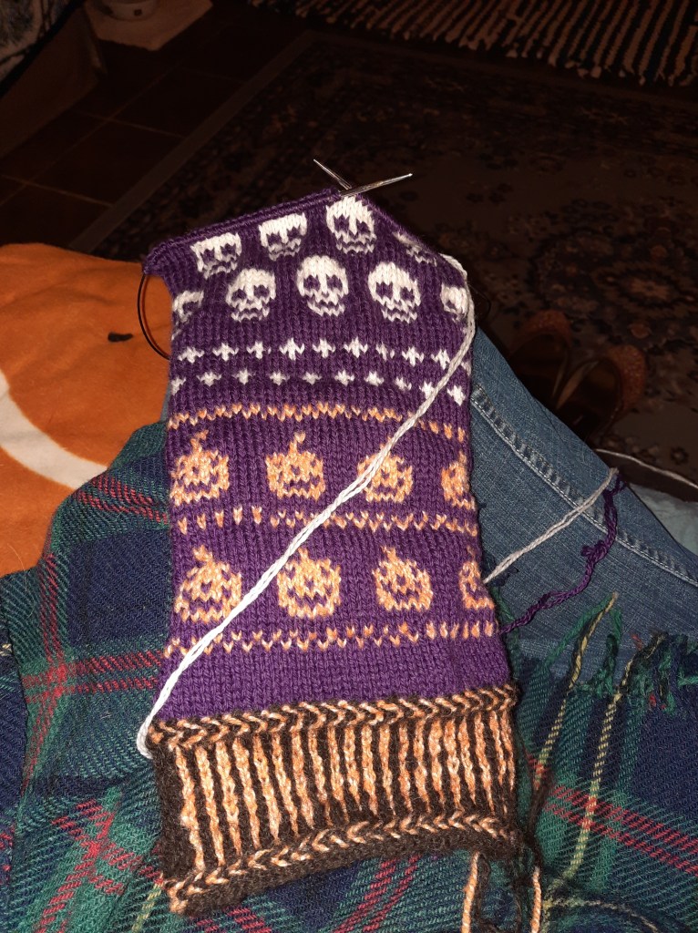 An ordinary custom request is when a customer requests a pair of socks, a hat, mittens, etc. that’s knit to size and color preferences, but gives me the freedom of design options. I knit these colorwork Halloween fingerless mittens and sold them in my Etsy shop.