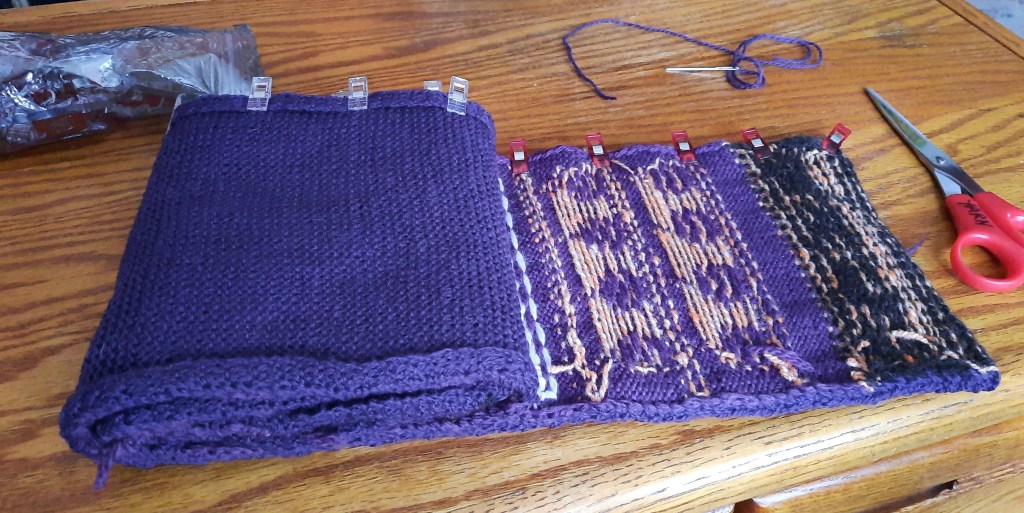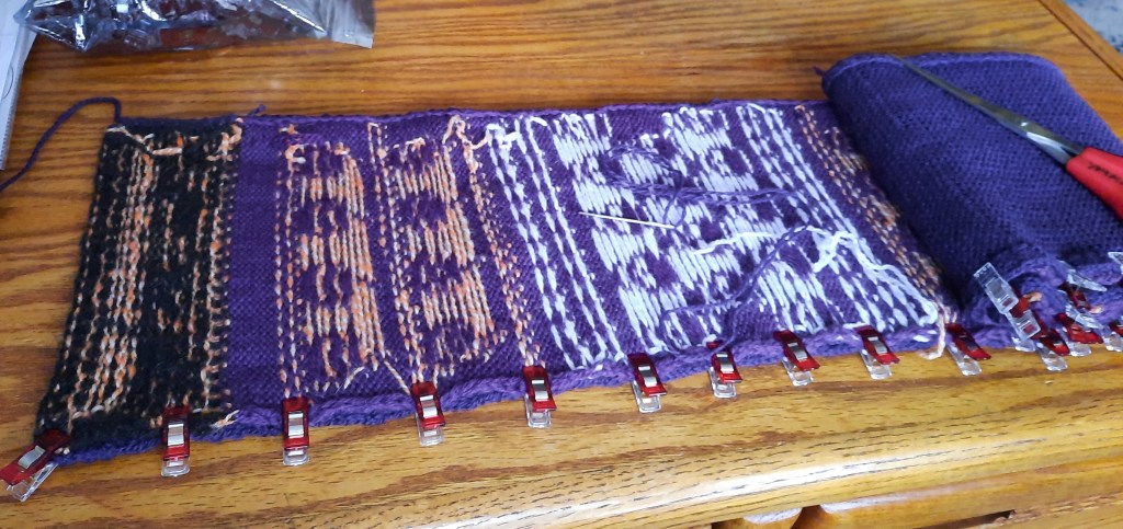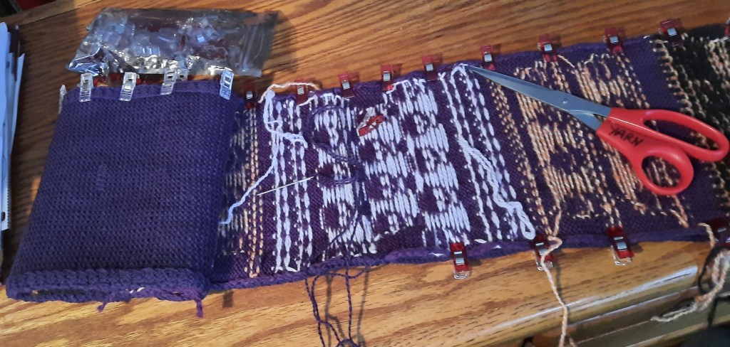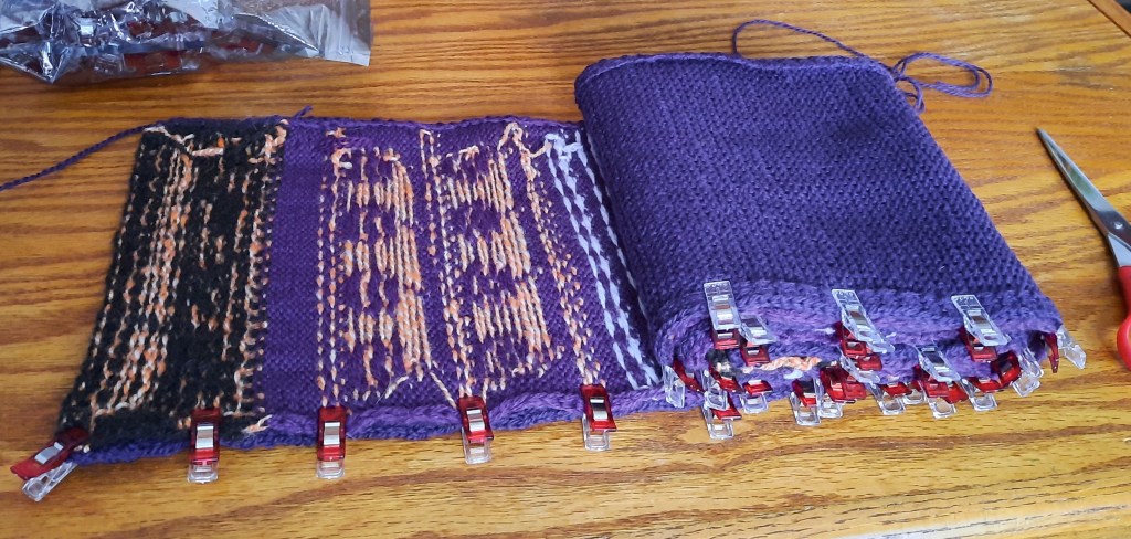 The following slideshow is of the seaming process. I knit a thin wool backing for this scarf to keep it wide and showy. I used sewing clips instead of pins because they’re absolutely wonderful for holding knit pieces, squishy cloth, and slippery cloth, etc. for hand sewing.