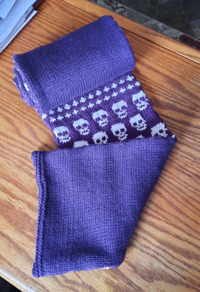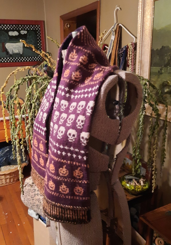 You’ll notice in the next two photos that I opted to knit the pattern I created in reverse, instead of placing the first half of the scarf onto waste yarn to be grafted onto the other half when it’s all finished. I’ve never liked that kind of scarf construction as it’s not as they make it look and quite frankly, I stink at grafting.