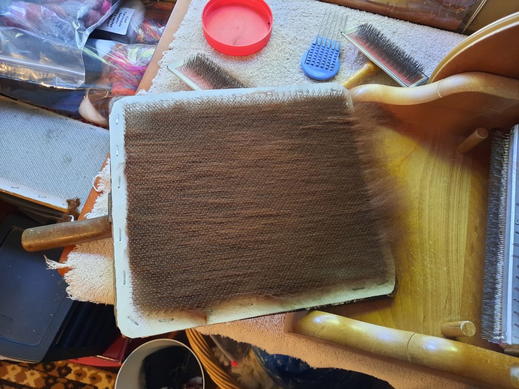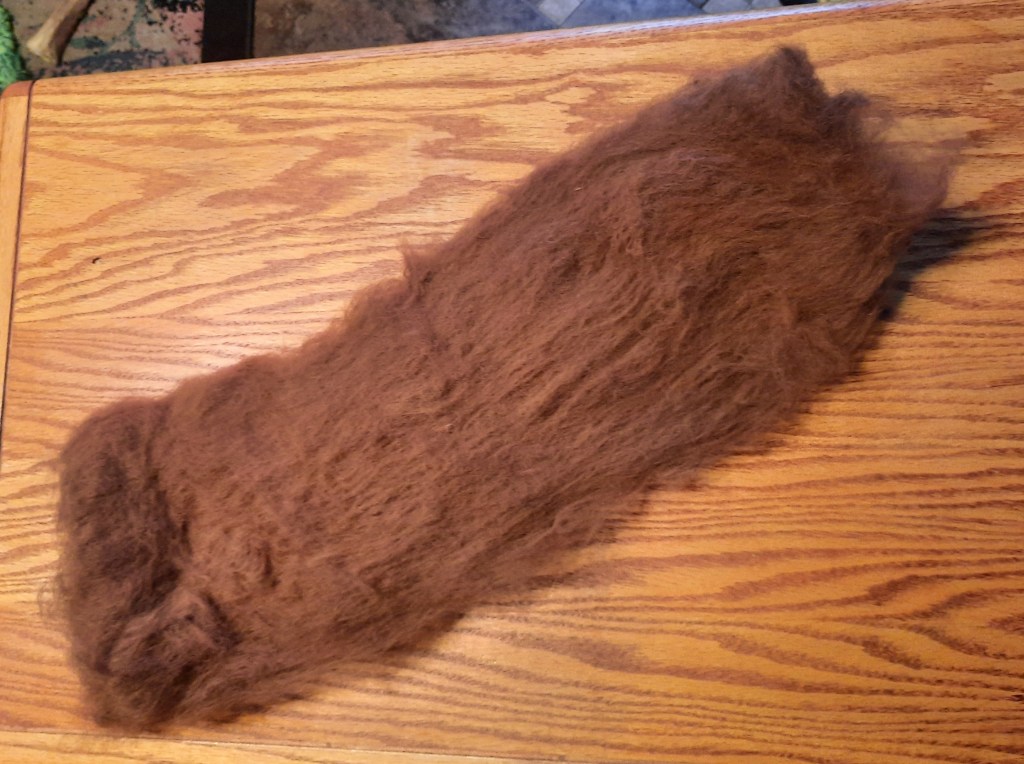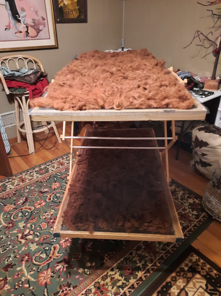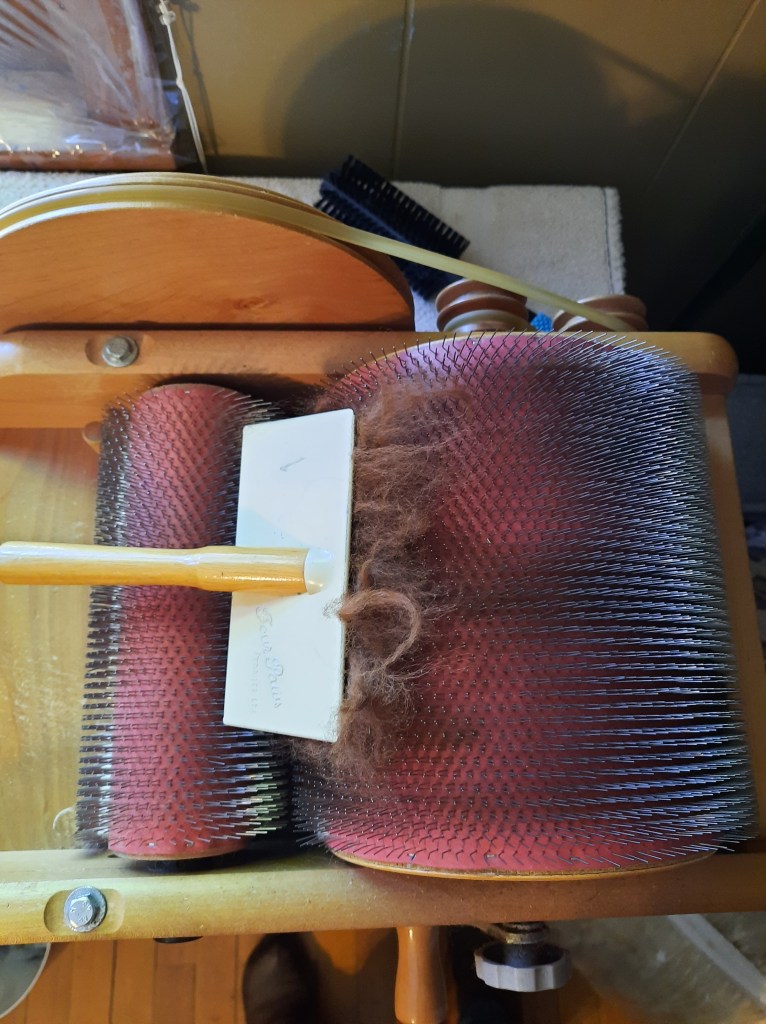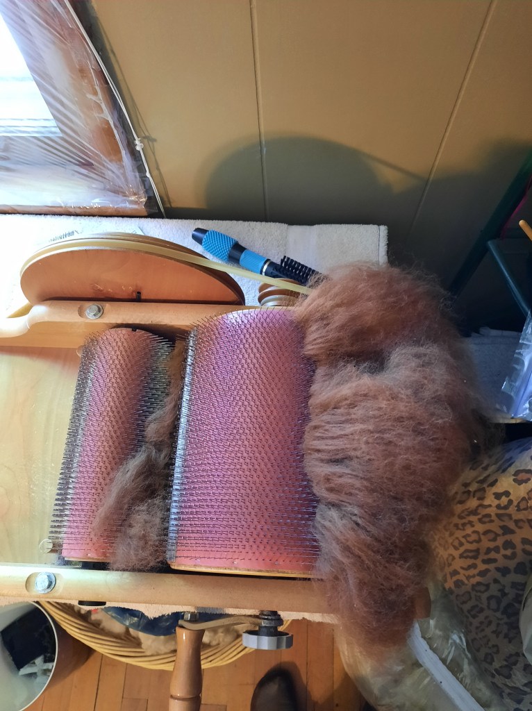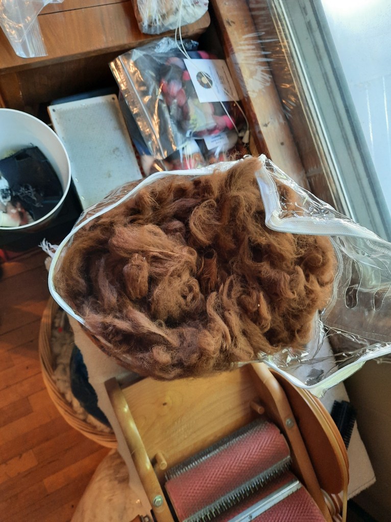 I’m privileged once again to have some alpaca fiber to process into yarn! It’s very exciting because it’s been over 5 years since I last had a whole fleece. I washed the chestnut alpaca fleece on Friday and have started carding it.