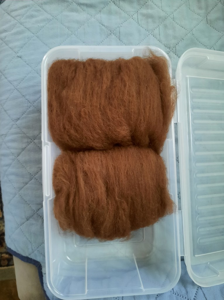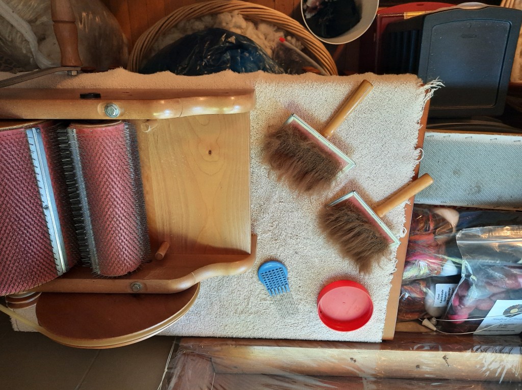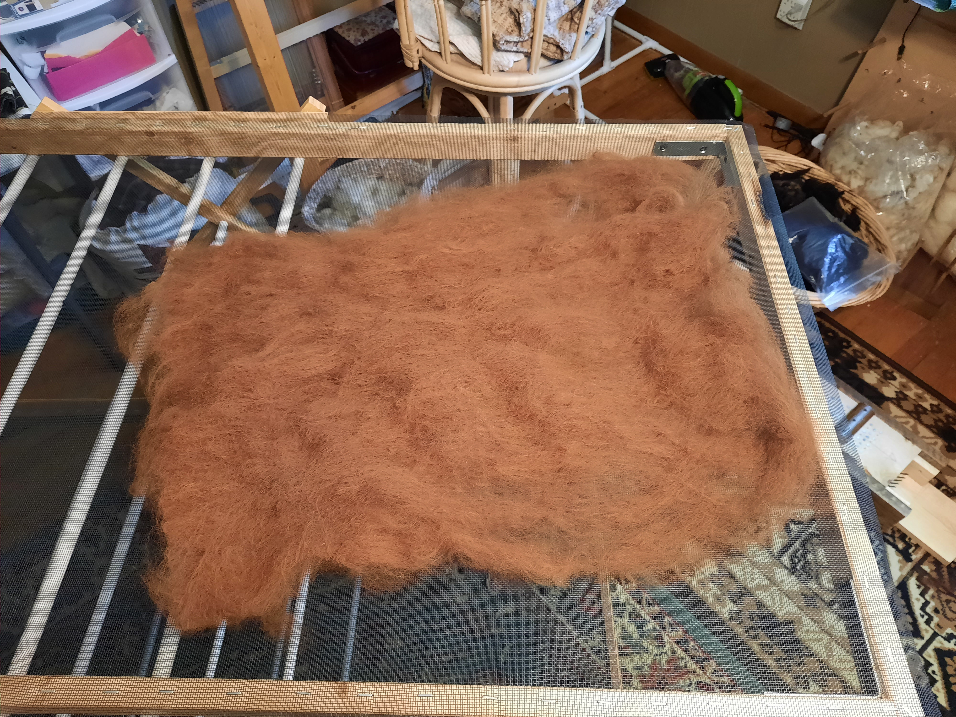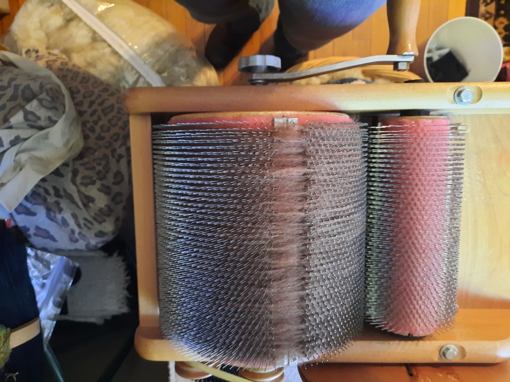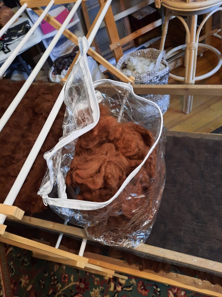 I’m privileged once again to have some alpaca fiber to process into yarn! It’s very exciting because it’s been over 5 years since I last had a whole fleece. I washed the chestnut alpaca fleece on Friday and have started carding it.