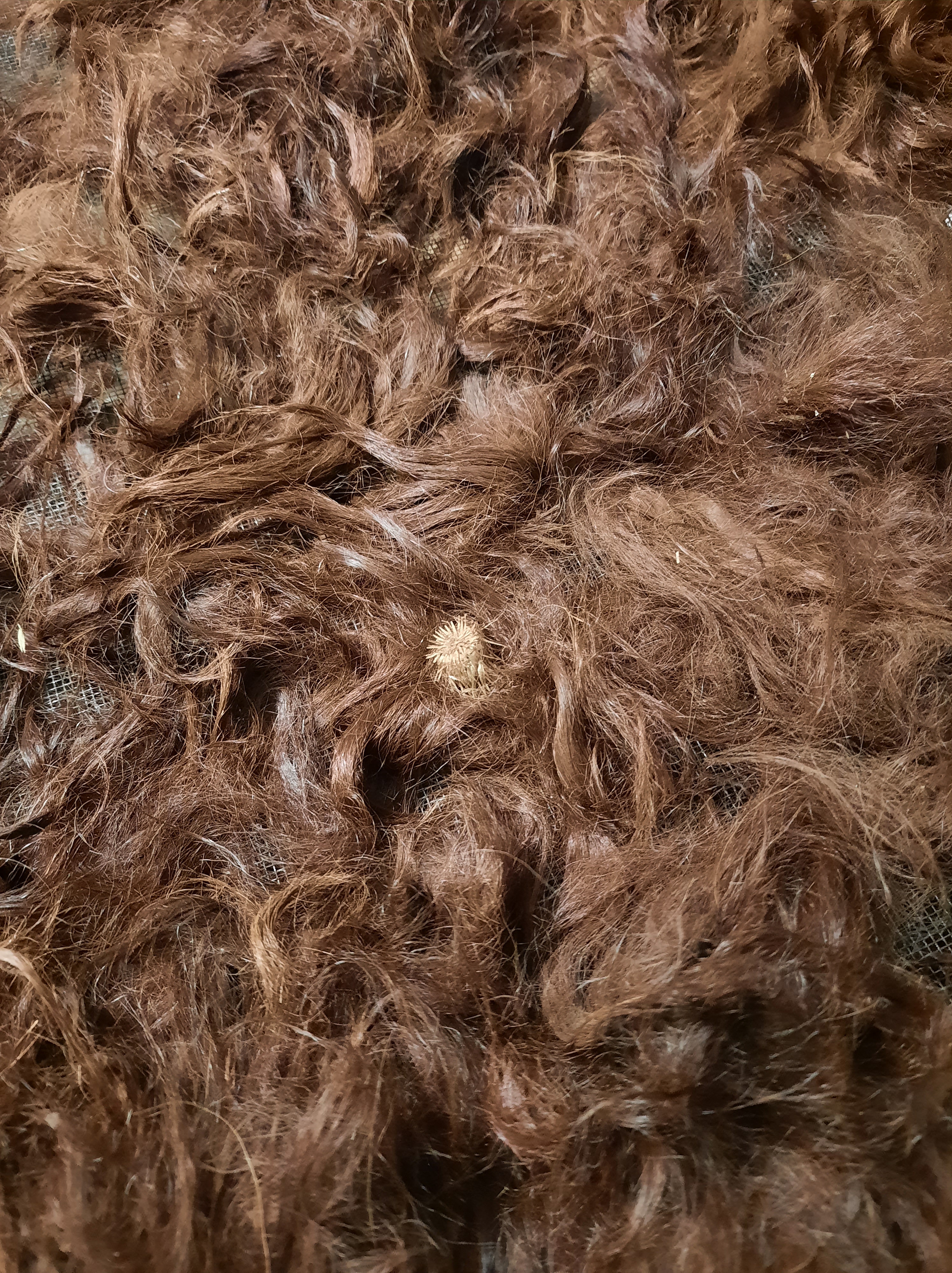I washed the dark brown alpaca fleece today. It took quite awhile because this particular creature had a penchant for rolling around in hay, straw, and cockle burrs! It’s not as fine as the chestnut, but will card up nicely.