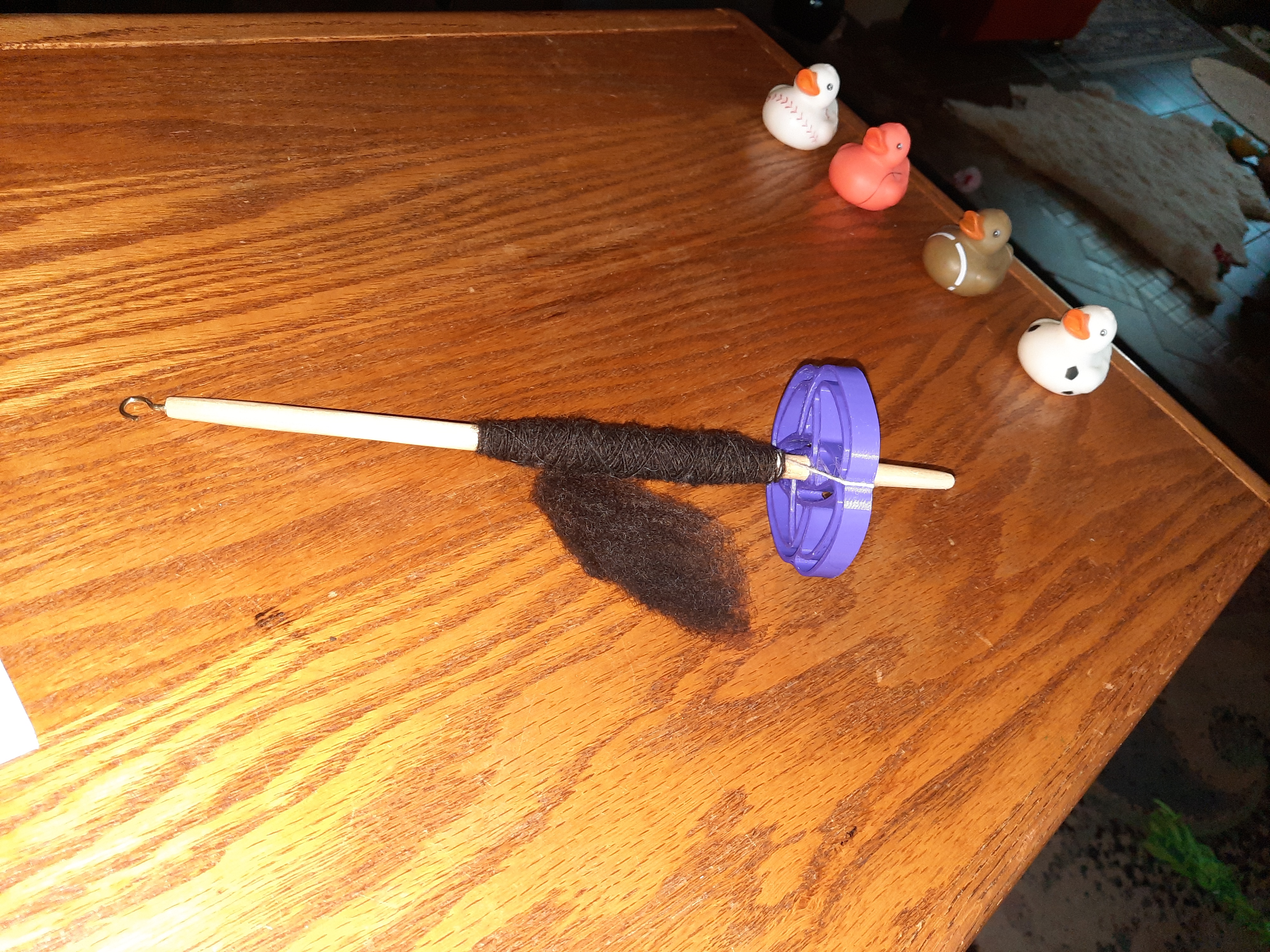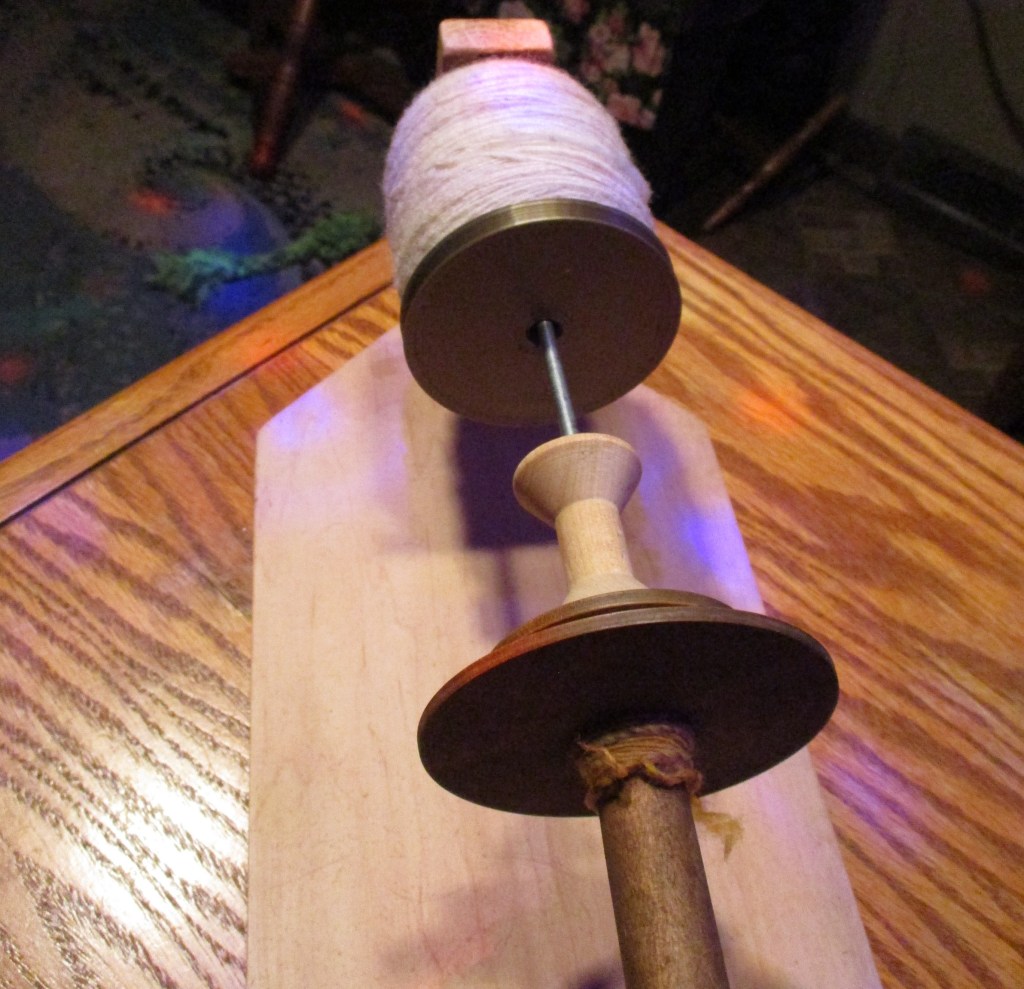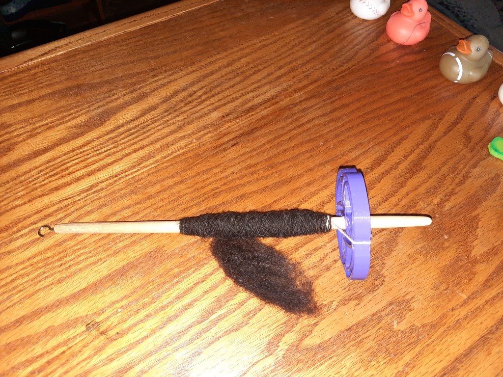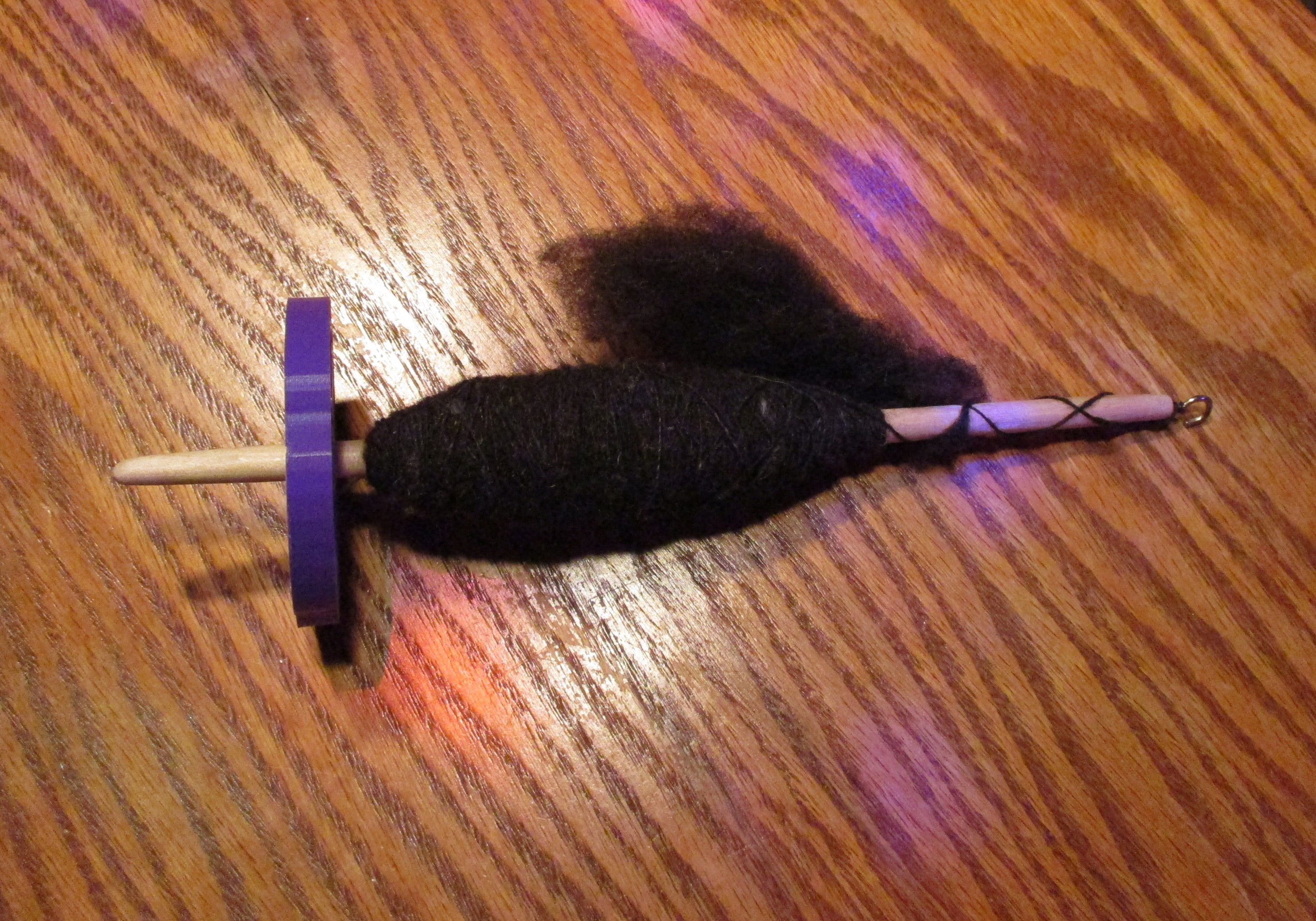This is a beautifully balanced spindle and the whorl is beautifully designed and crafted. I’m spinning black Corriedale fleece on it and it’s spinning up quite nicely.