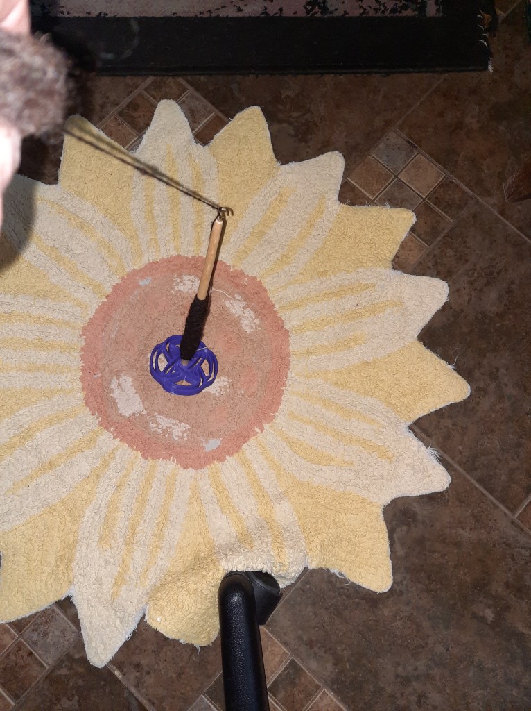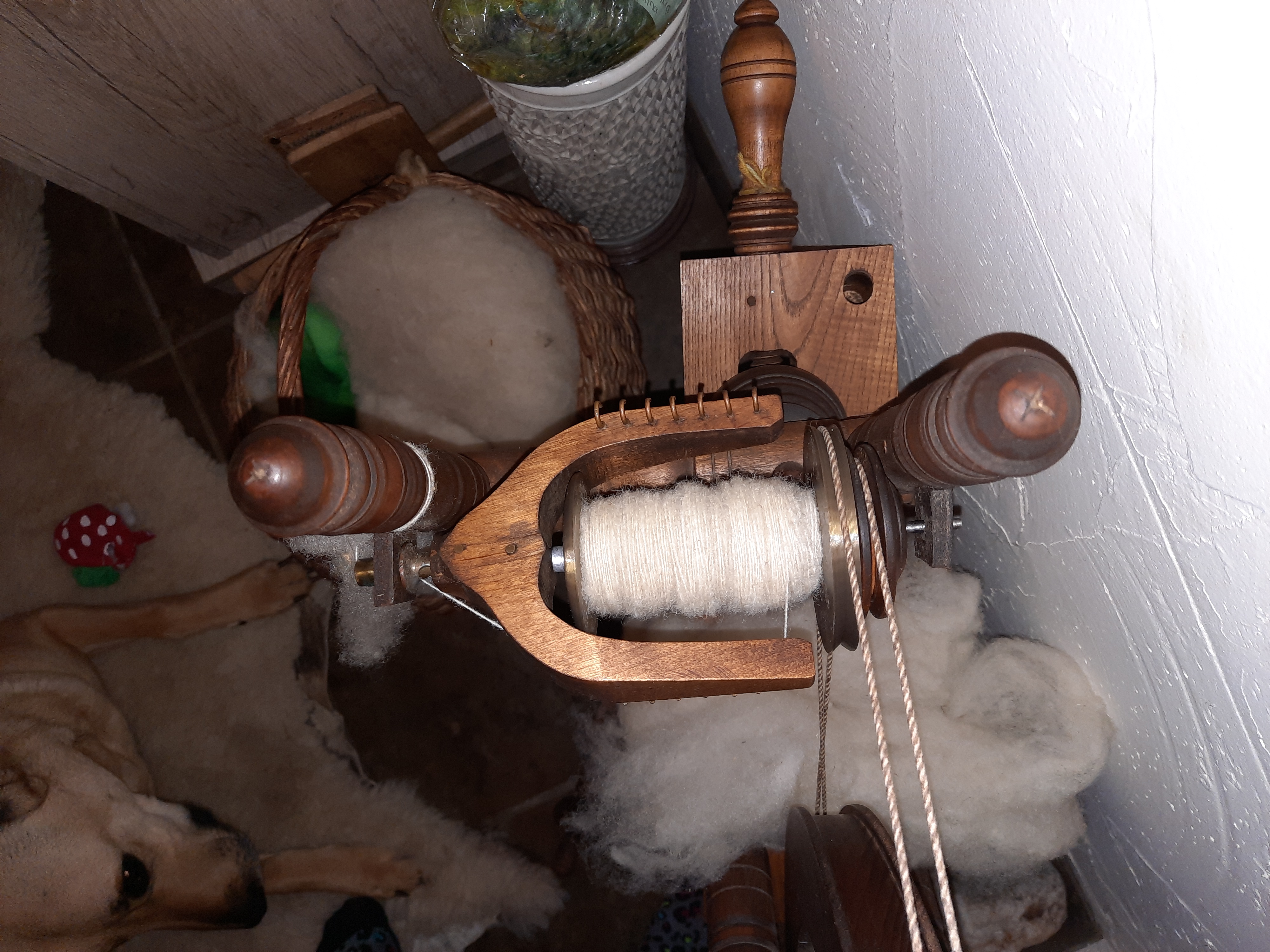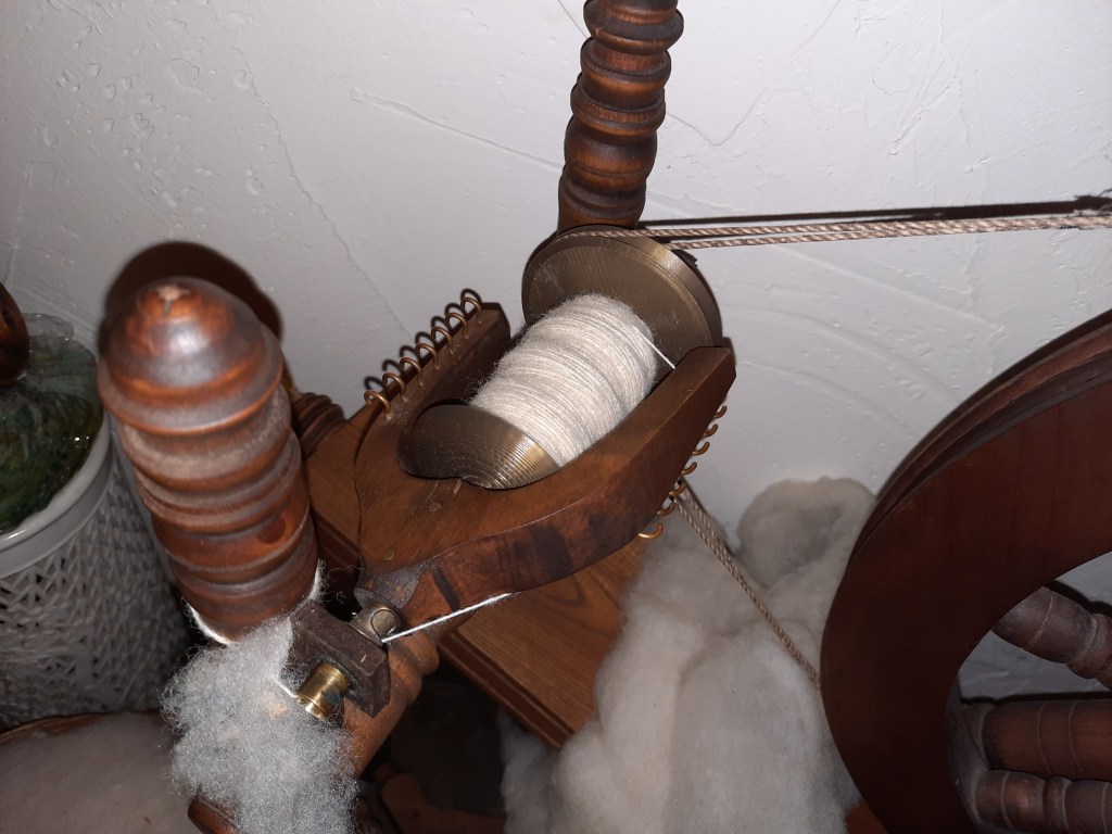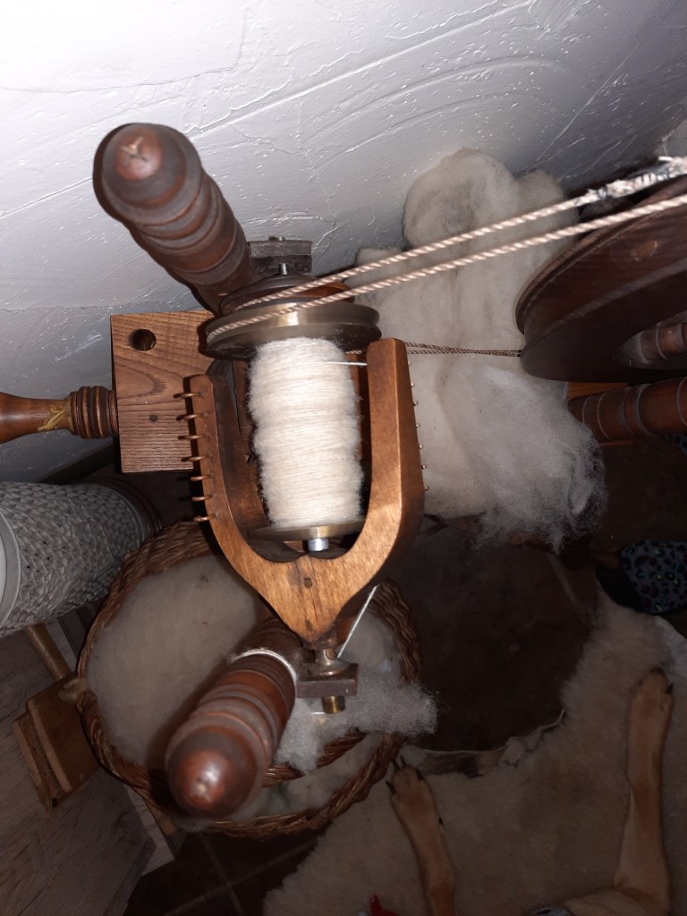 This is a beautifully balanced spindle and the whorl is beautifully designed and crafted. I’m spinning black Corriedale fleece on it and it’s spinning up quite nicely.
