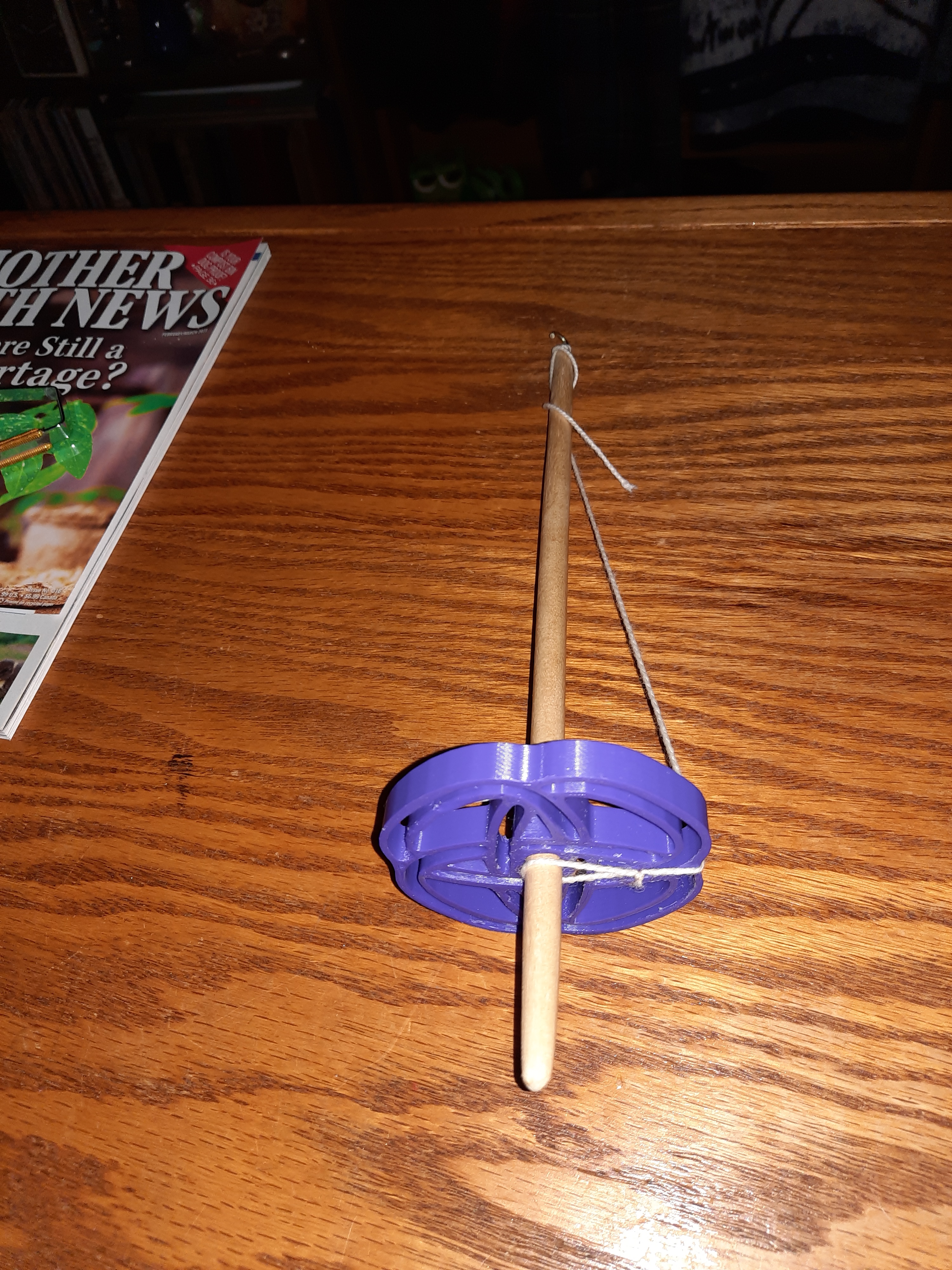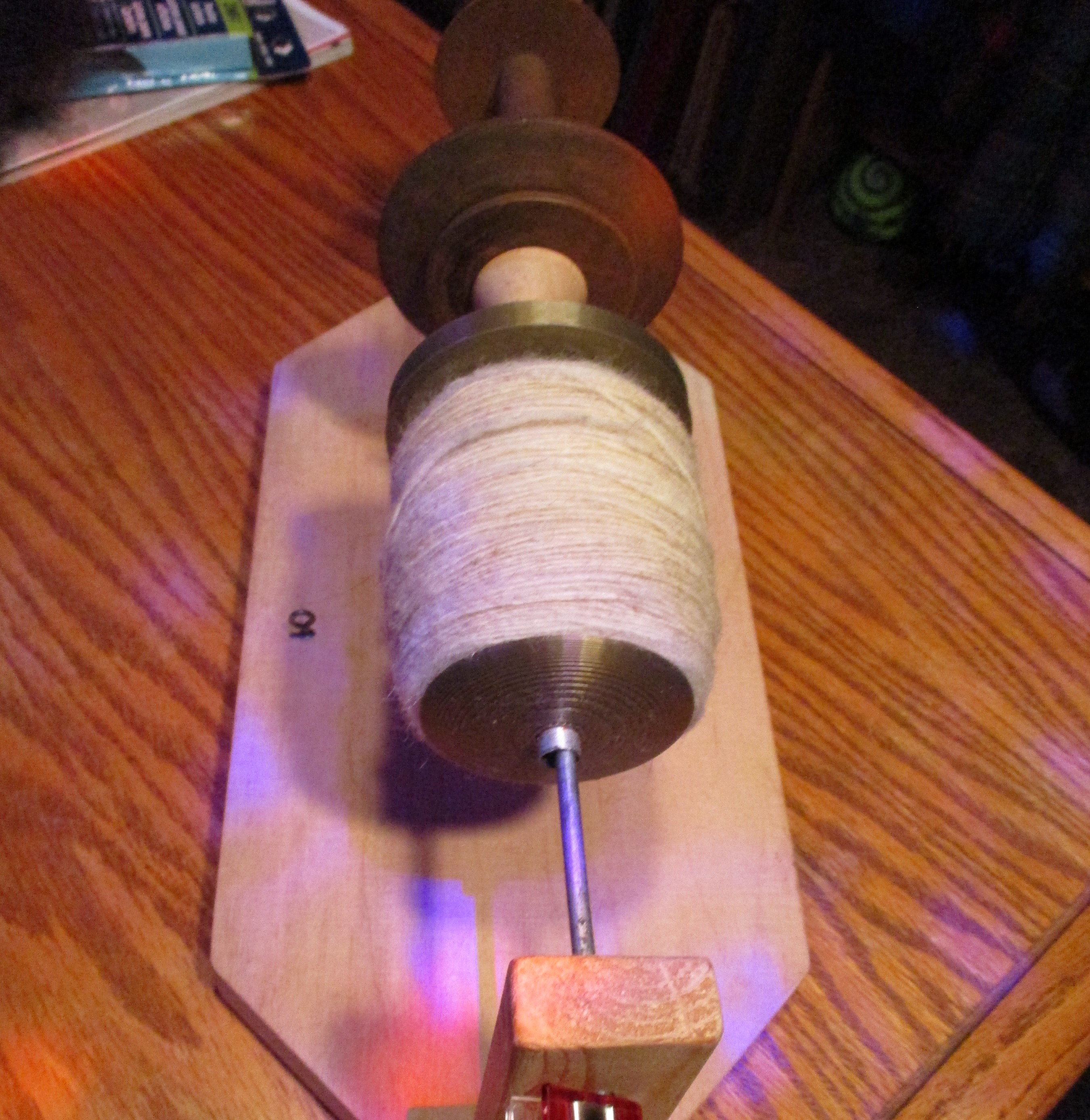 The spindle kit comes with a pine wood dowel, a brass hook, and a neat, geometric, 3-D printed whorl in a huge selection of colors. I substituted an oak dowel that was longer and balanced the better with the whorl. I always like to carve the spindle dowels so they’re tapered at both ends and wax them before I secure the whorl.