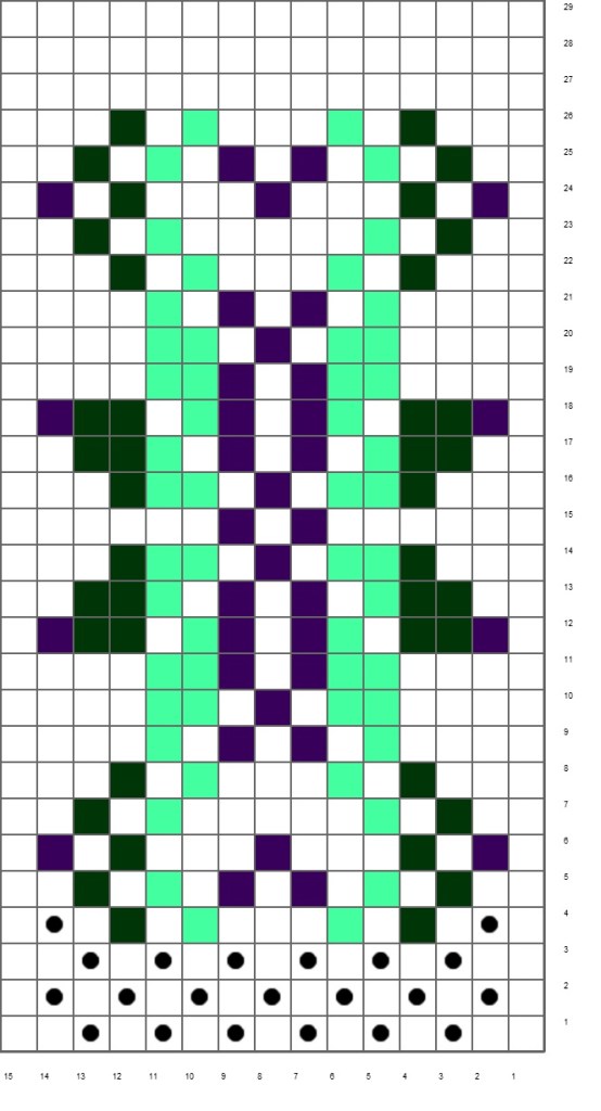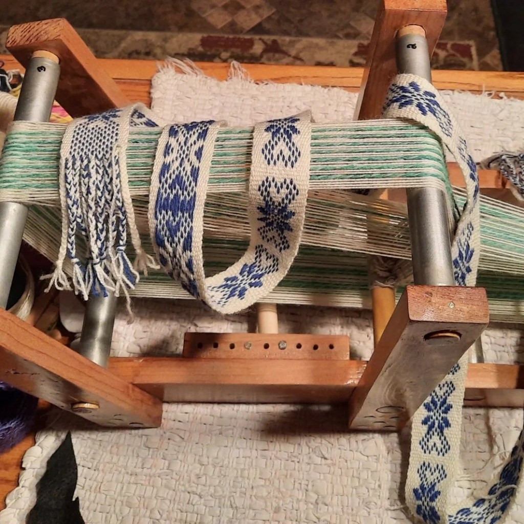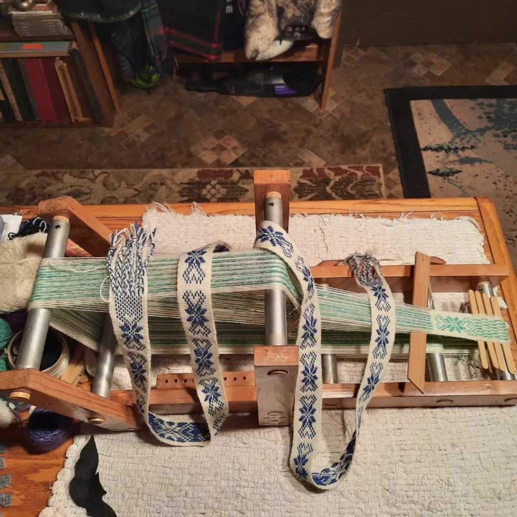 I’ve been warping the inkle loom with 9 extra warp threads (4 up and 5 down) on each side of the pattern(s) because I like more selvage on the edges. This next band/belt will be in dark violet, handspun handdyed light turquoise green, forest green, and the single outside pattern edge in hte dark violet.